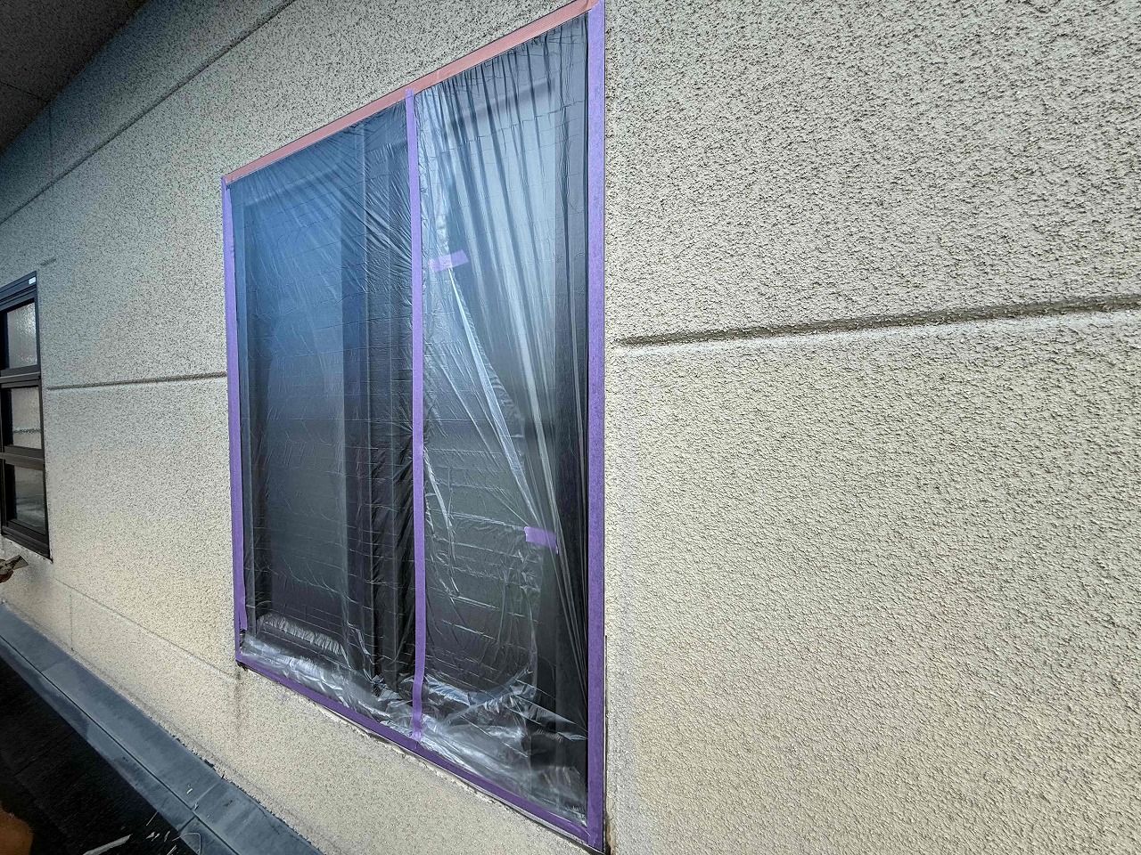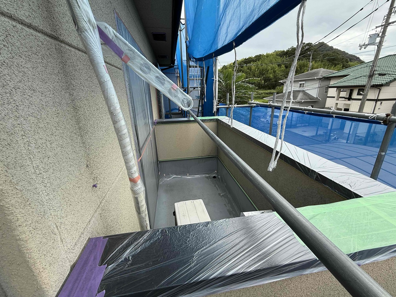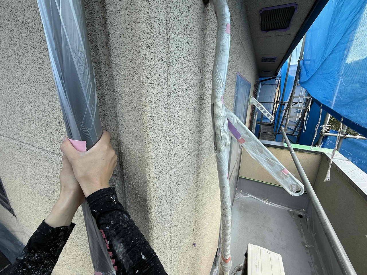 先日、高圧洗浄が完了しており、本日養生作業を行いました。