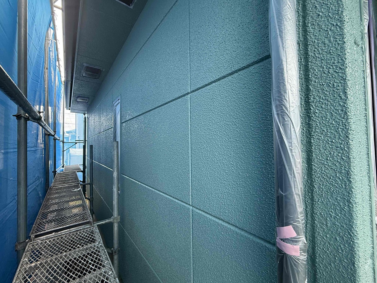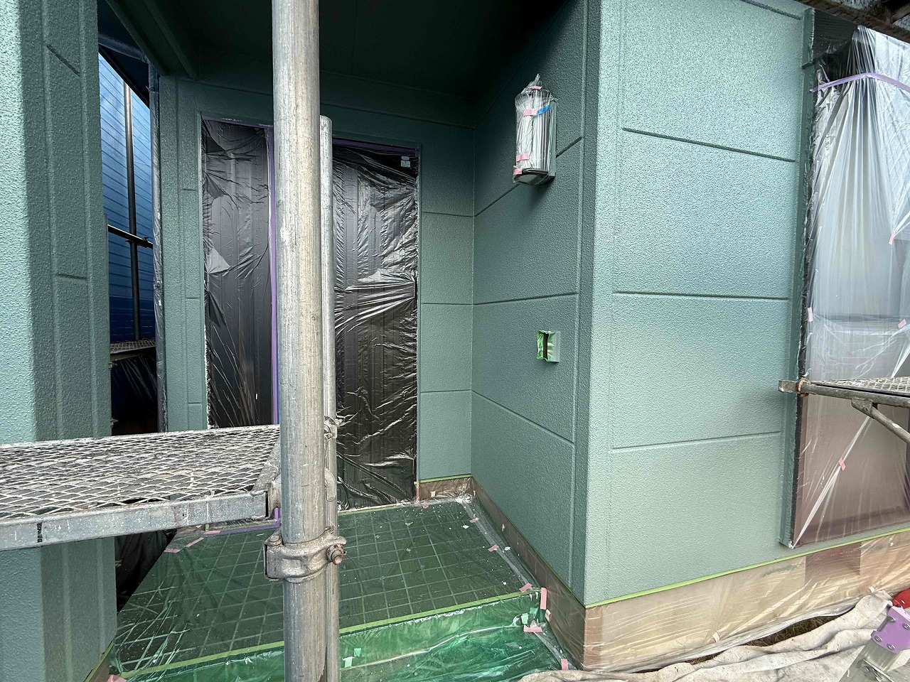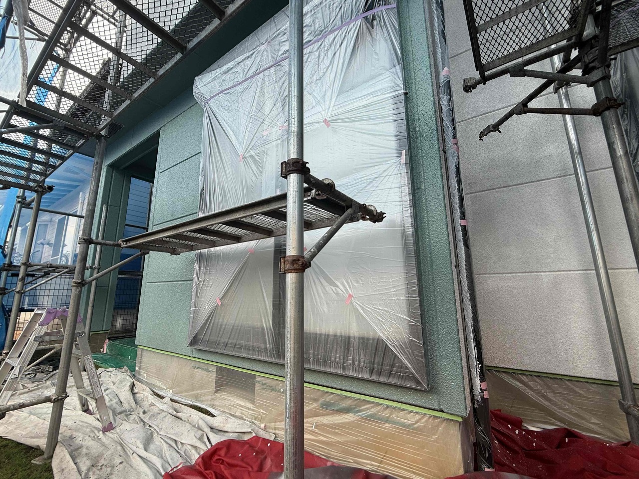 先日、外壁塗装の中塗り(2回目塗装)を行っており、