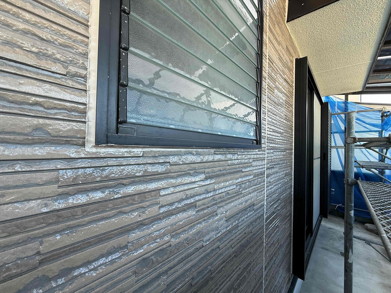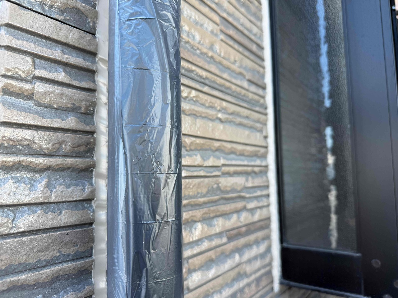 本日、目地と窓枠のコーキング作業を行いました。これにてすべての工事が完了いたしましたので、後日足場の解体をさせていただく予定となっております。