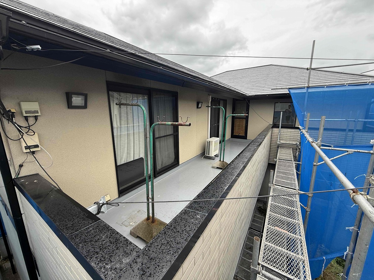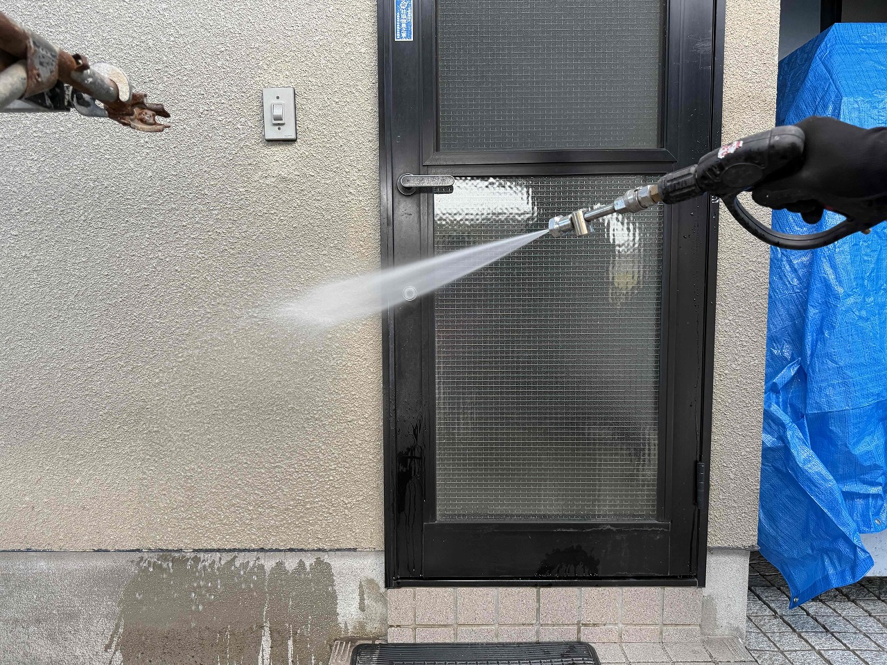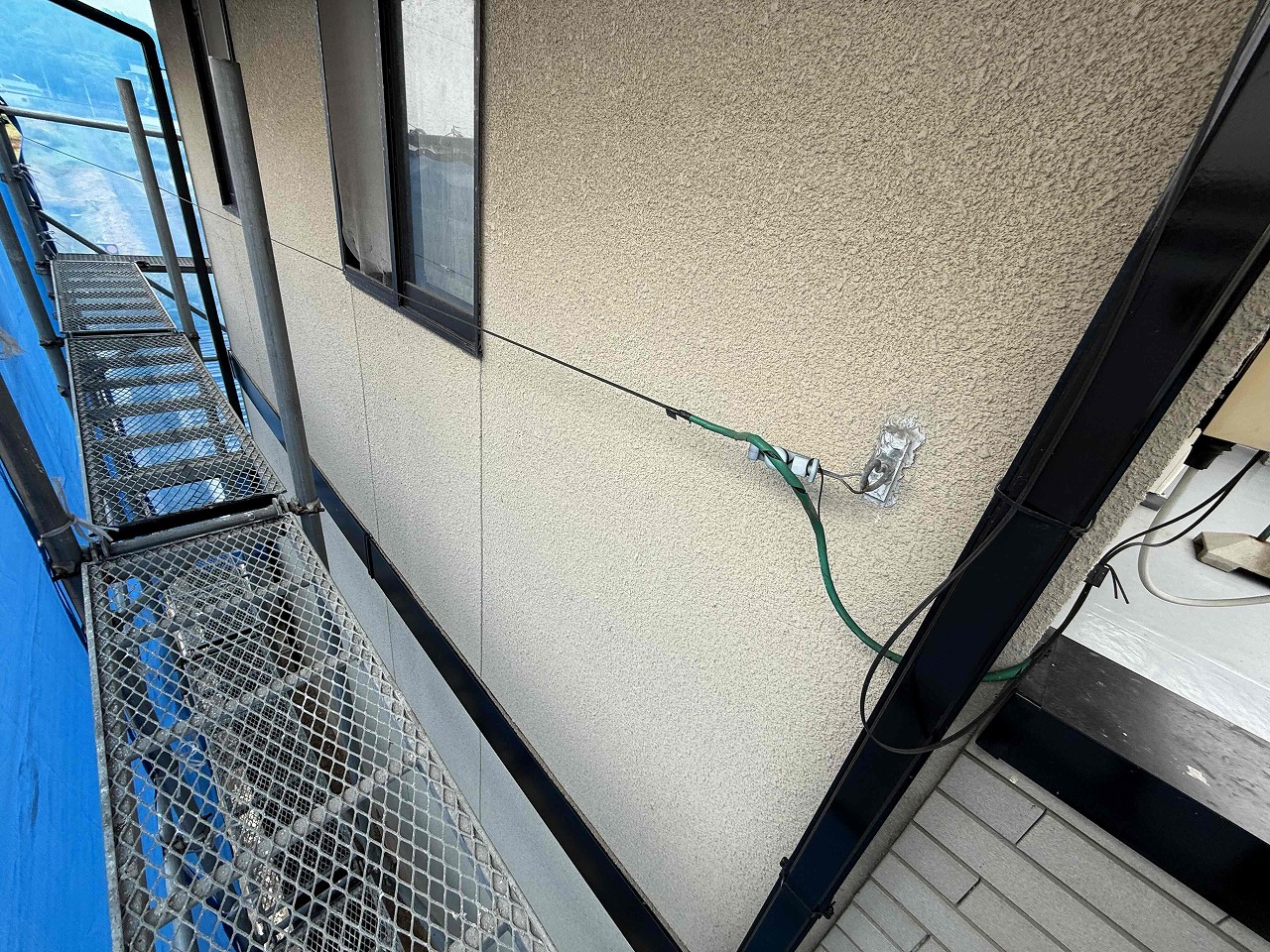 先日、仮設足場の設置が完了しており、本日は外壁の高圧洗浄を行いました。