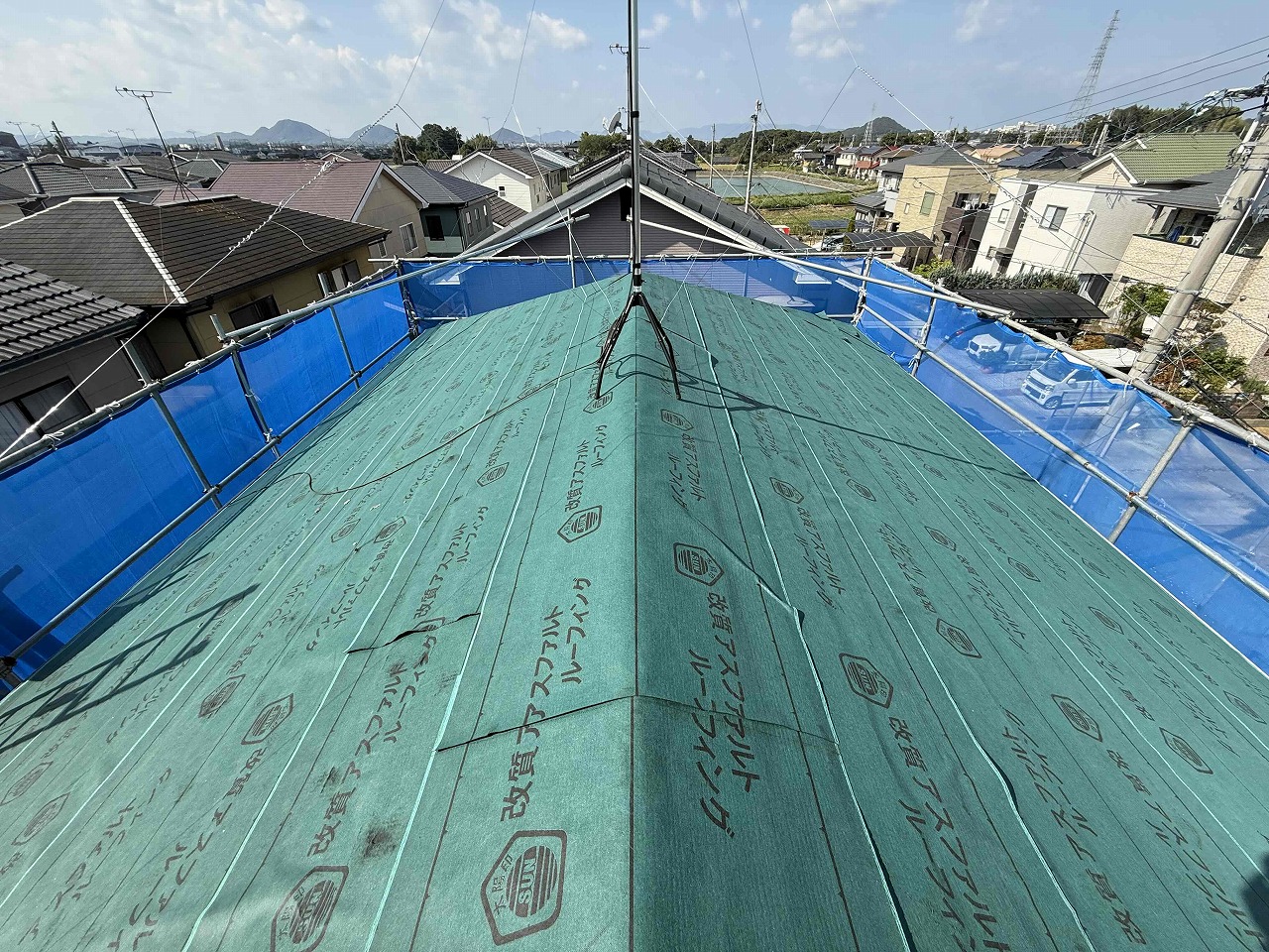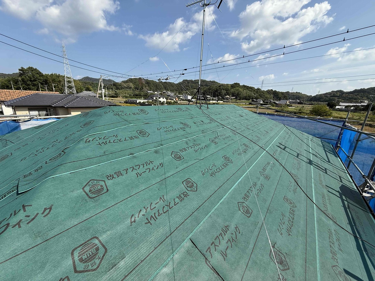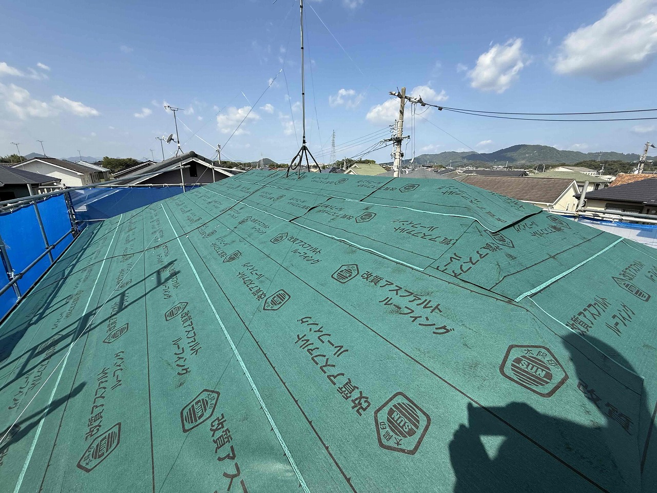 先日、外壁塗装工事が完了しており、本日より屋根のカバー工法工事を着工いたしました。本日はルーフィング(防水シート)の施工を行い、明日より屋根材の施工を行っていく予定となっております。引き続きよろしくお願いいたします!😄