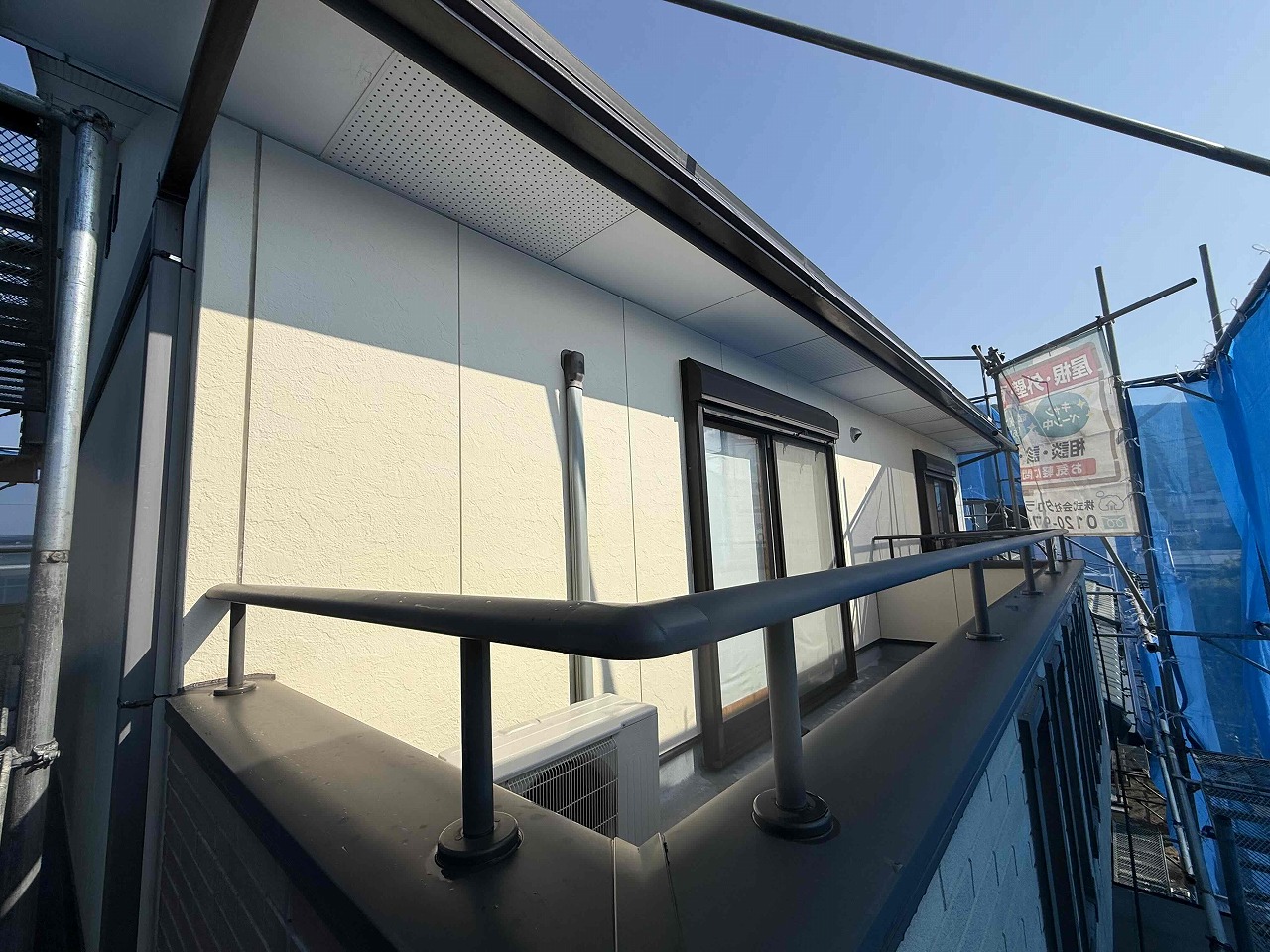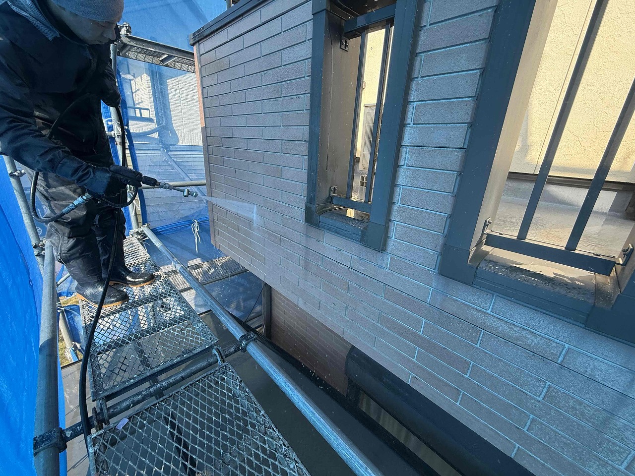 先日、仮設足場の設置が完了しており、本日は外壁の高圧洗浄を行いました!