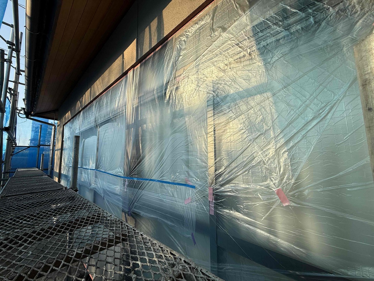 先日、高圧洗浄が完了しており、本日は養生作業を行いました。明日は、外壁塗装工事(日本ペイント使用)の下塗り(1回目塗装)を行っていく予定となっております。引き続きよろしくお願いいたします!😄