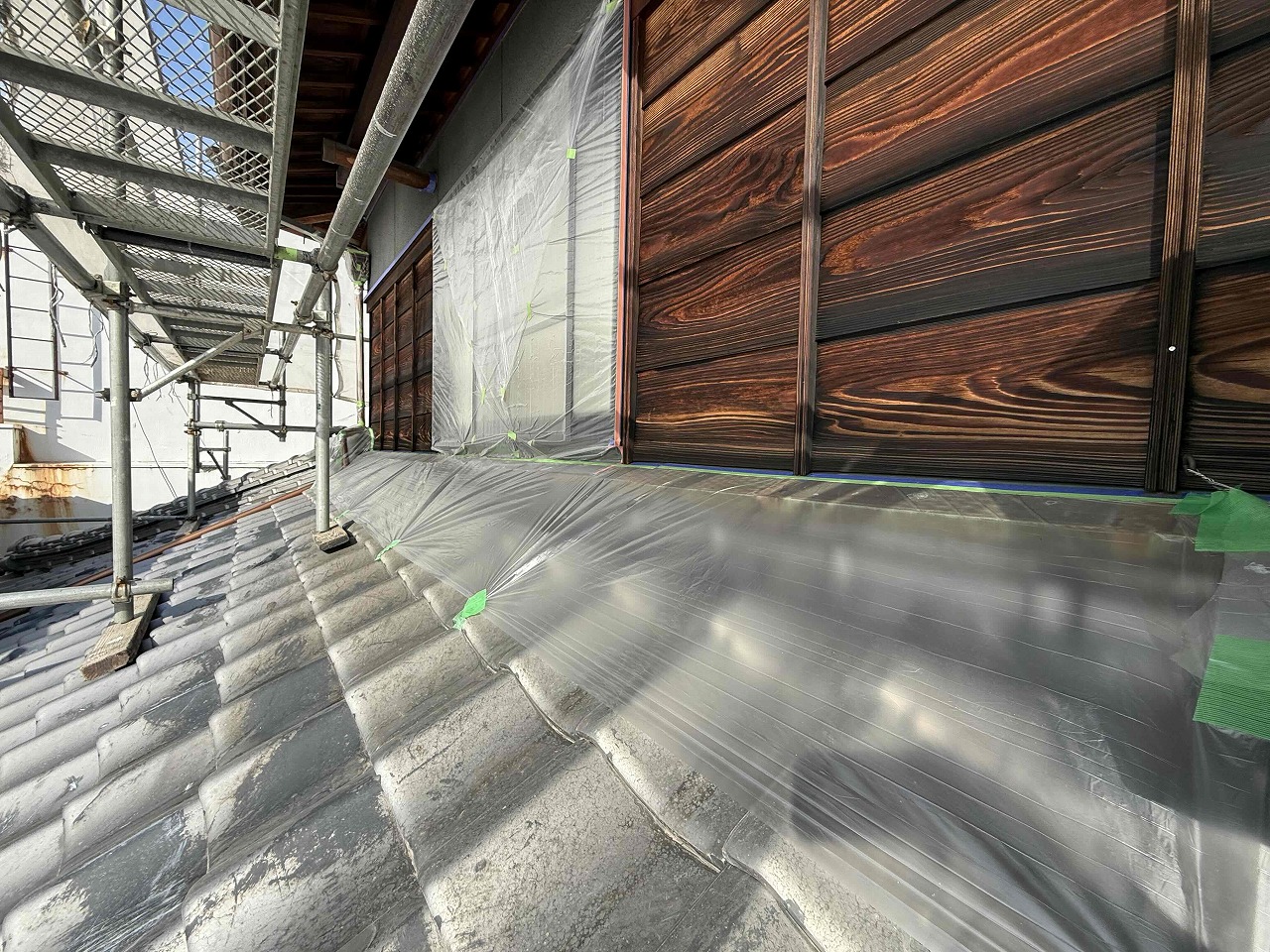 先日高圧洗浄が完了しており、本日は外壁塗装工事前の養生作業を行いました!