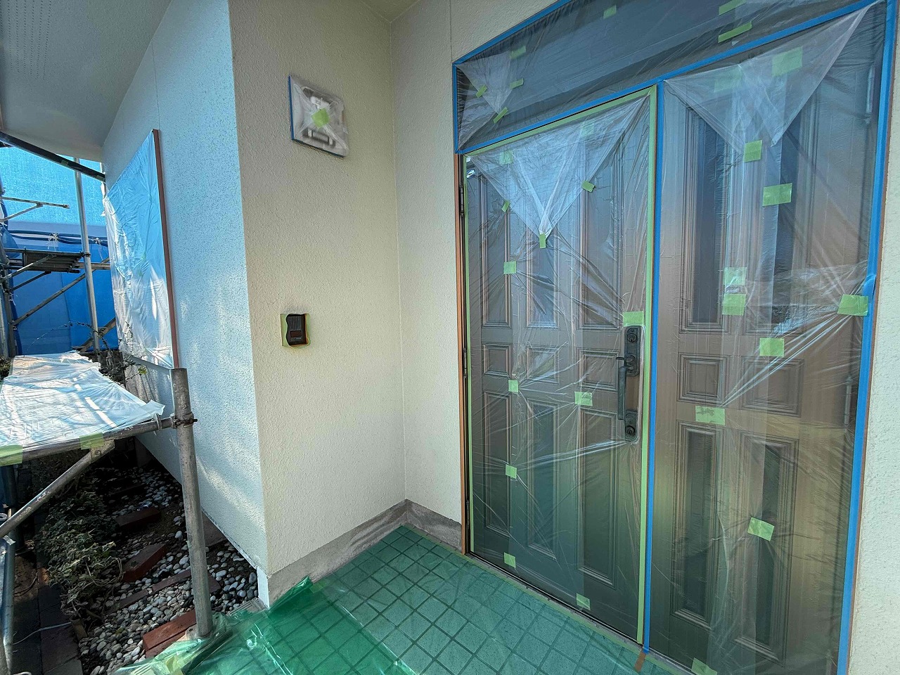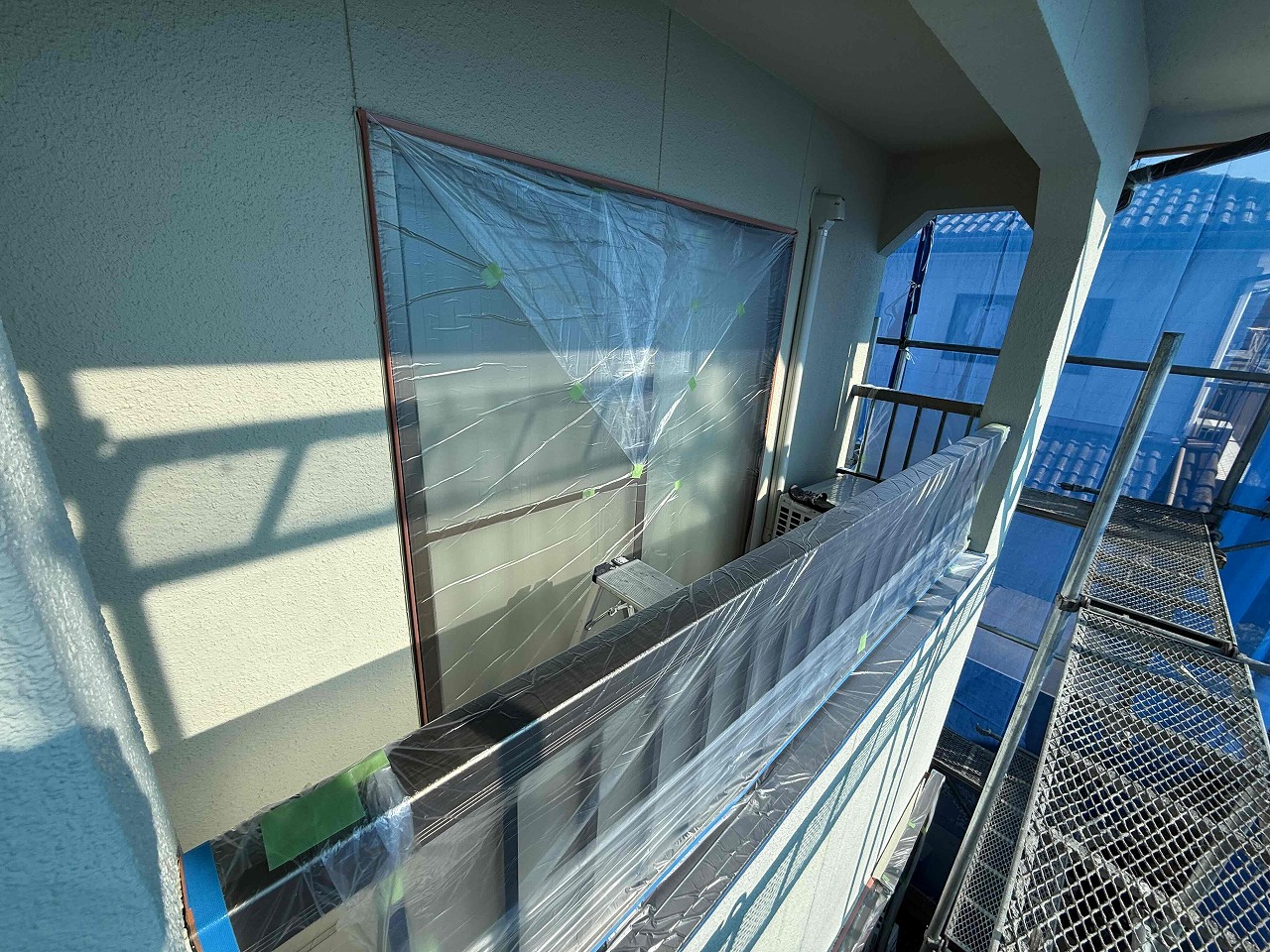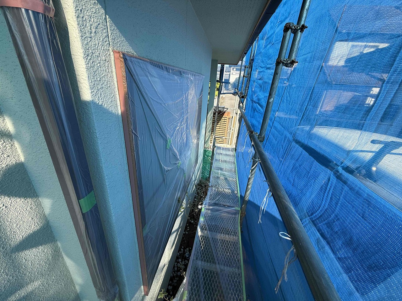 先日、高圧洗浄が完了しており、本日は養生作業を行いました。