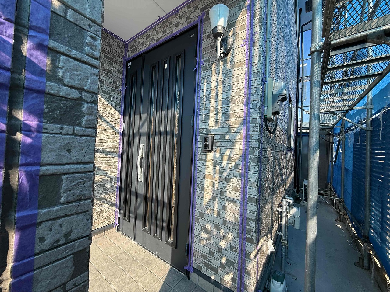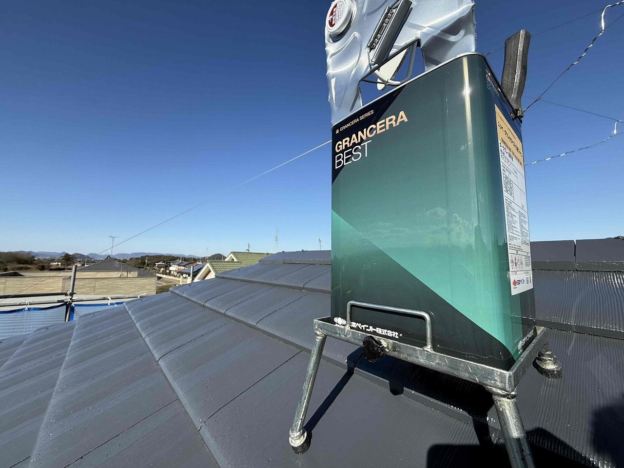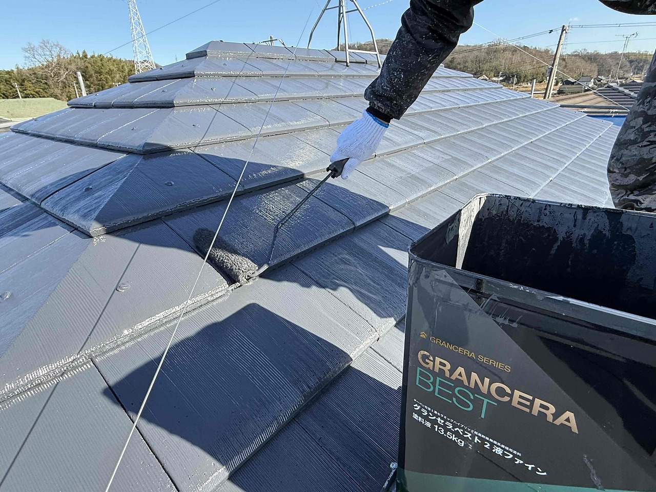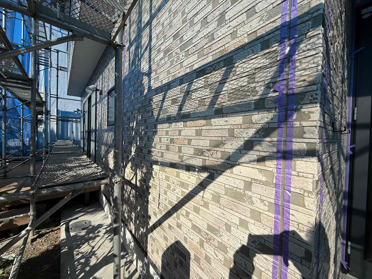 先日、屋根塗装の中塗り(2回目塗装)が完了しており、本日は午前中に上塗り(3回目塗装)を行い、午後より目地のコーキング工事前の養生作業を行いました!