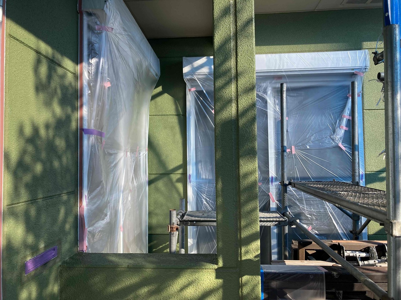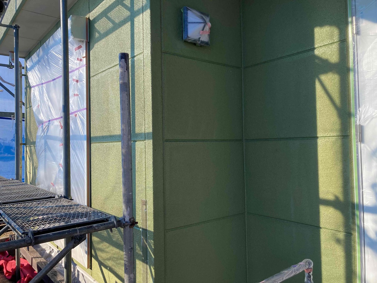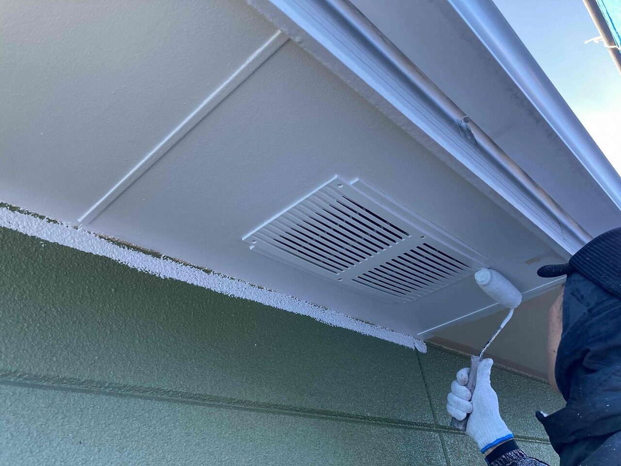 先日、養生作業が完了しており、本日は外壁塗装の下塗り(1回目塗装)を行ったのち、軒天塗装(日本ペイントケンエース)を行いました。明日、中塗り(2回目塗装)を行っていく予定となっております。引き続きよろしくお願いいたします!😄
