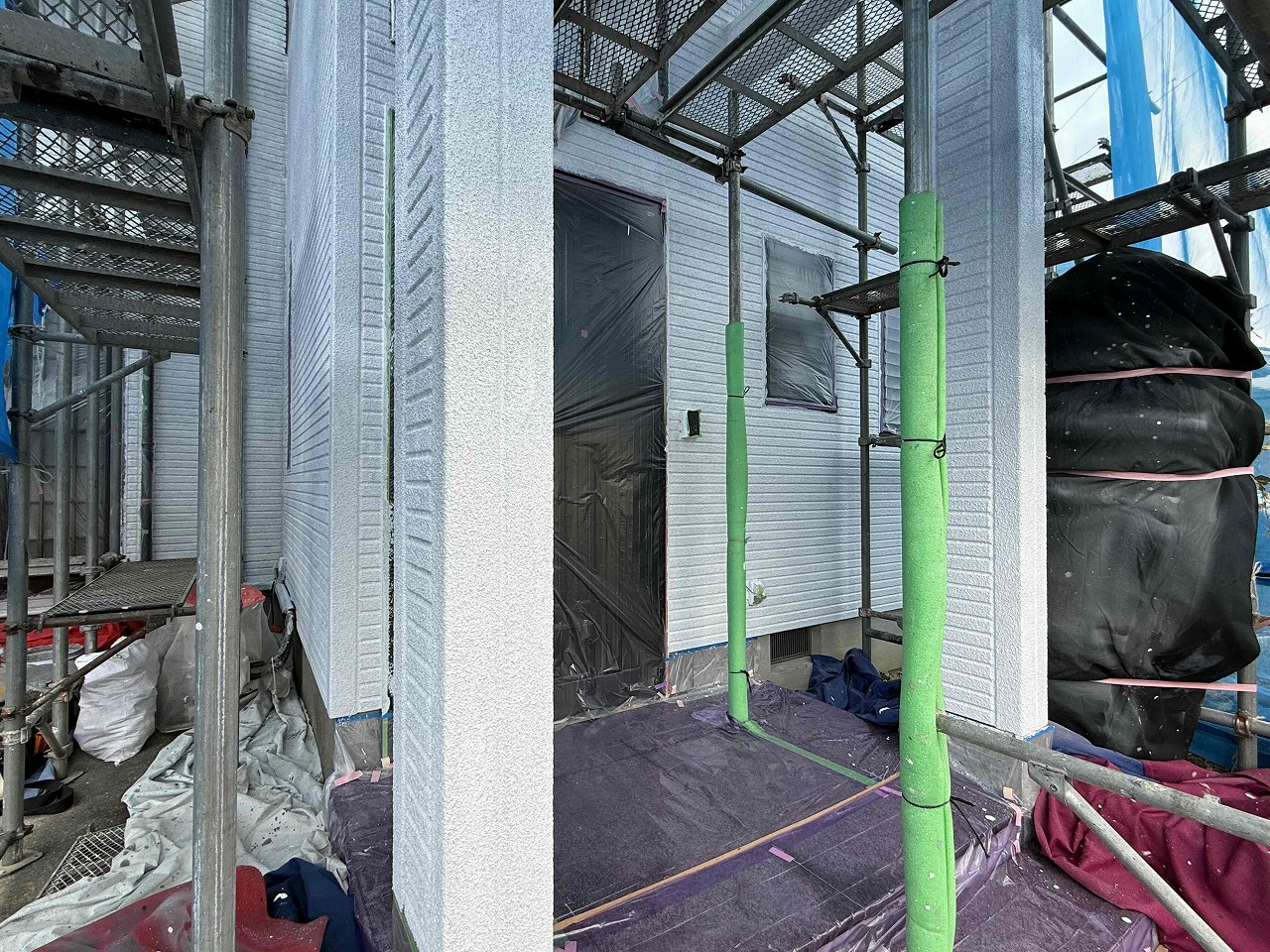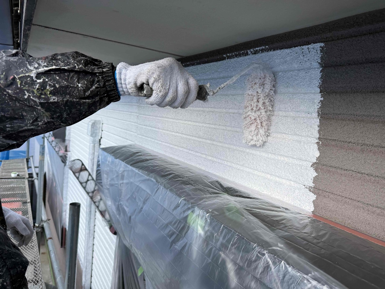 先日、養生作業が完了しており、本日は外壁塗装の下塗り(1回目塗装)を行いました。明日は日曜日で職人が休みのため、月曜日より続きを行っていく予定となっております。引き続きよろしくお願いいたします!😄