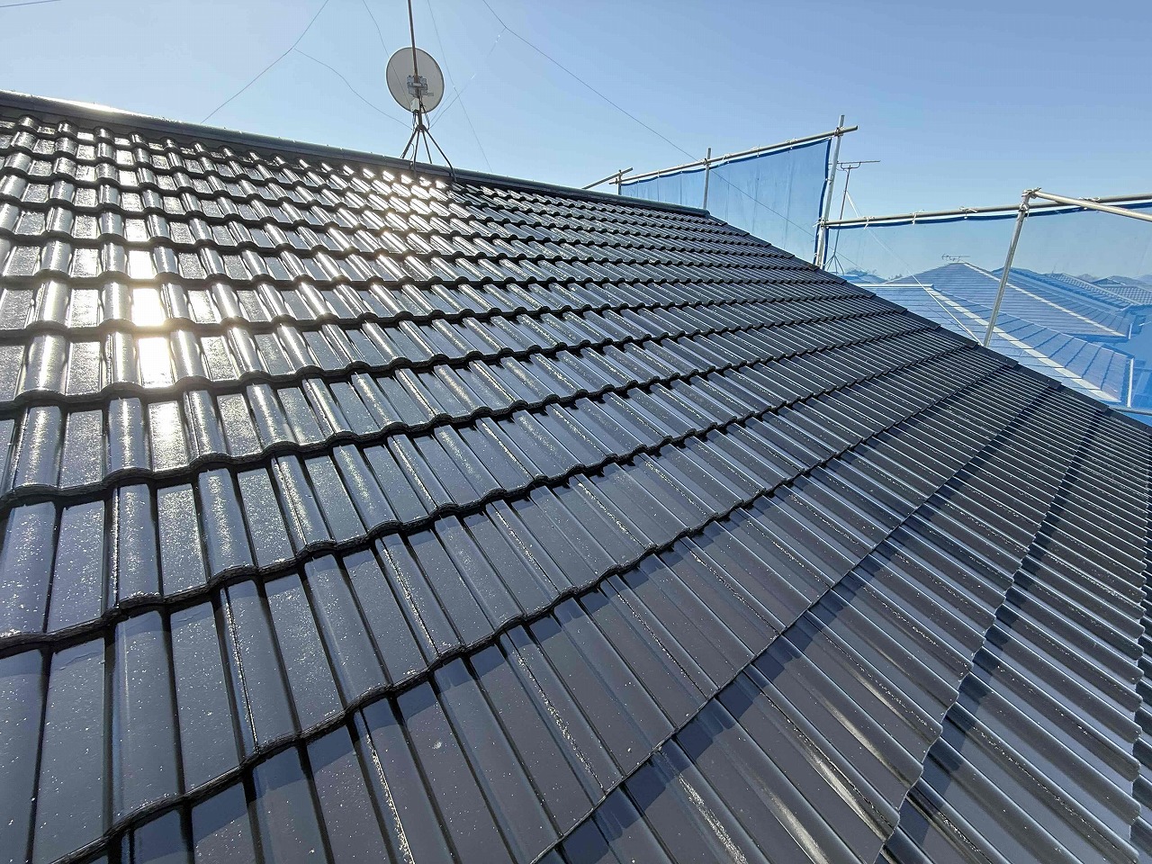 先日、屋根塗装工事の下塗り(1回目塗装)を行い、本日は中塗り(2回目塗装)を行いました。明日、3回目の塗装となるタフグロスコート(クリヤーコーティング)を行っていく予定となっております。引き続きよろしくお願いいたします!😄