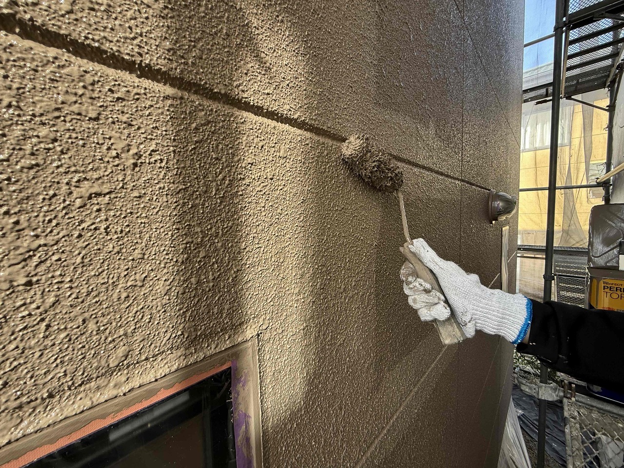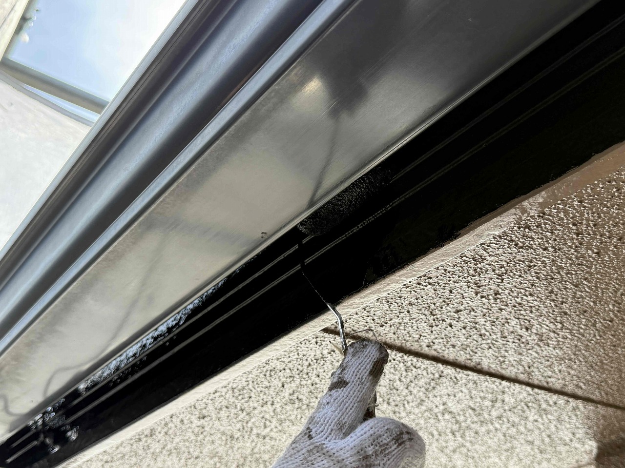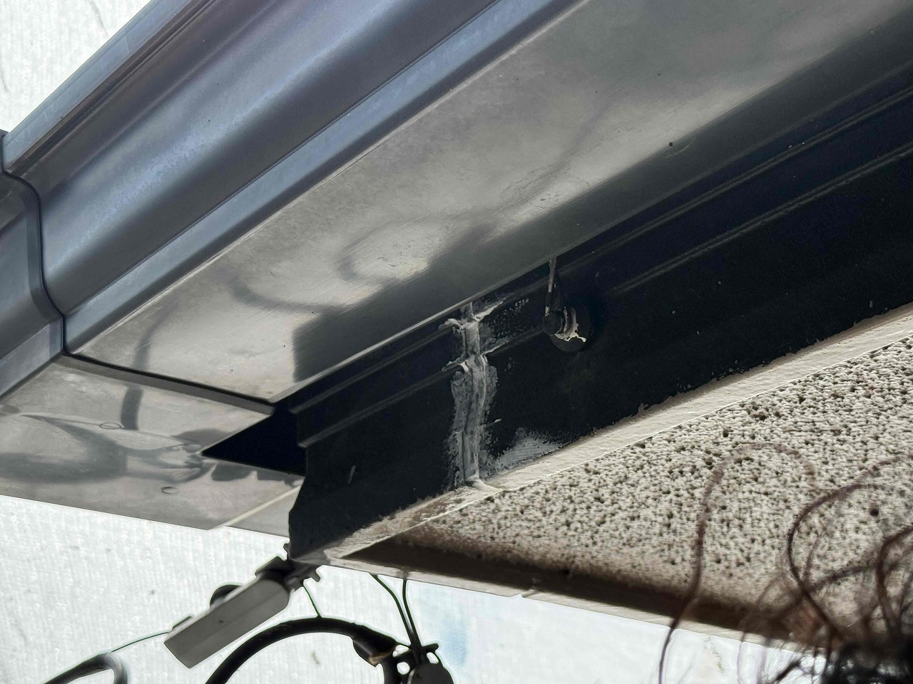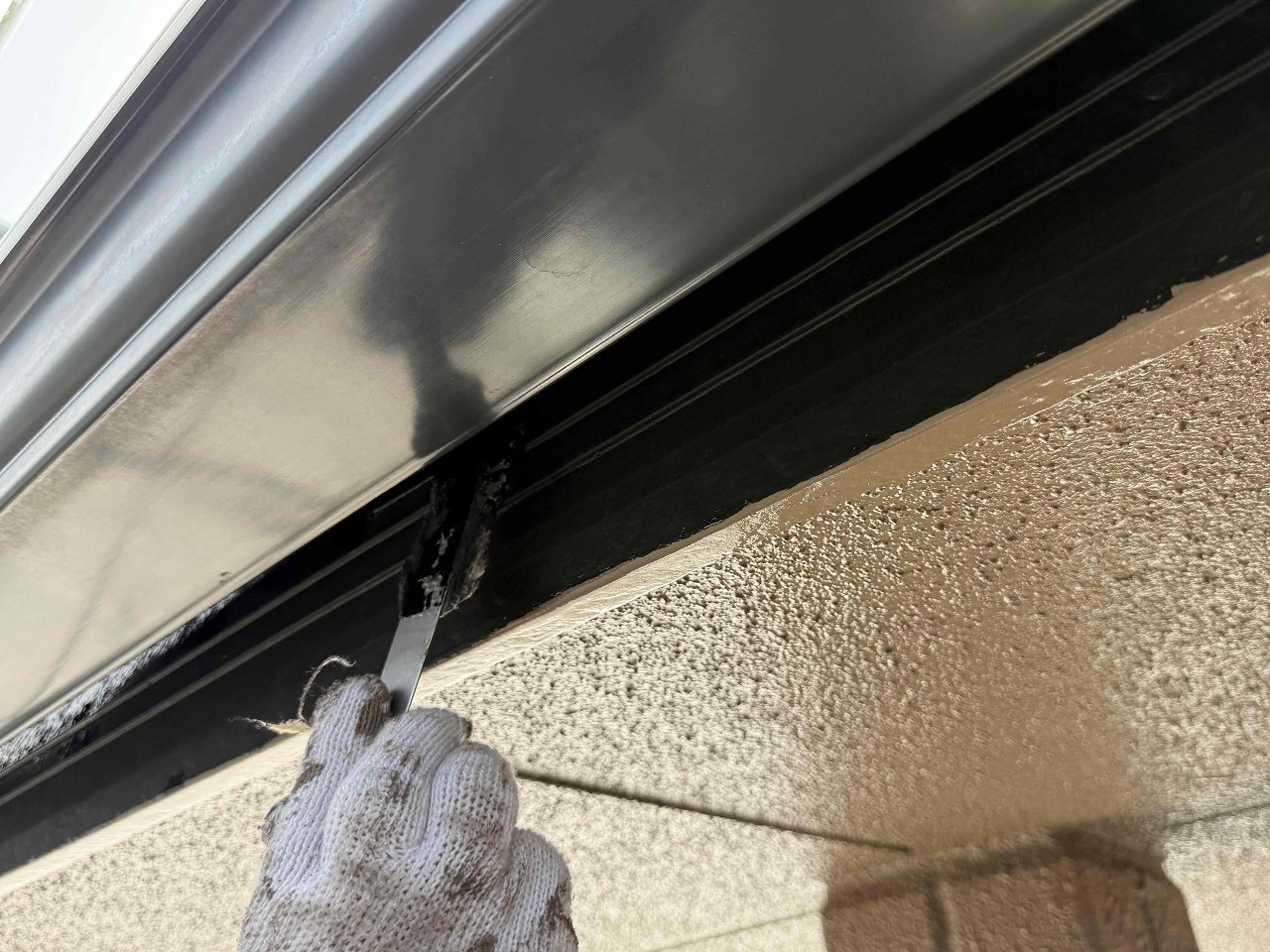 本日は、午前中に外壁塗装工事の上塗り(3回目塗装)を行い、午後に雨樋の裏部分の鼻隠しのシーリングと塗装(専用のハケとローラーを使って)を行いました。