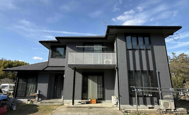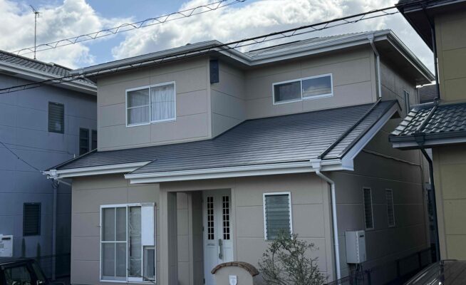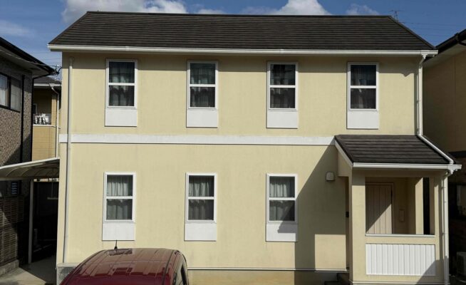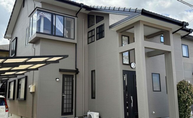 ご相談 外壁の塗膜が薄くなっており、防水機能が弱まっていた。工事内容 1.足場設置 2.高圧洗浄 3.養生 4.目地シーリング工事 5.外壁塗装3回塗り 6.その他付帯塗装工事 7.足場解体 7.完工