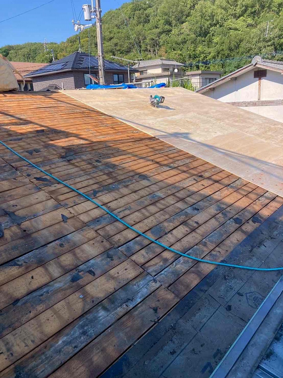 既存の瓦が年数経過により防水機能がかなり弱まっていたので重たい瓦を軽い瓦に変更した。