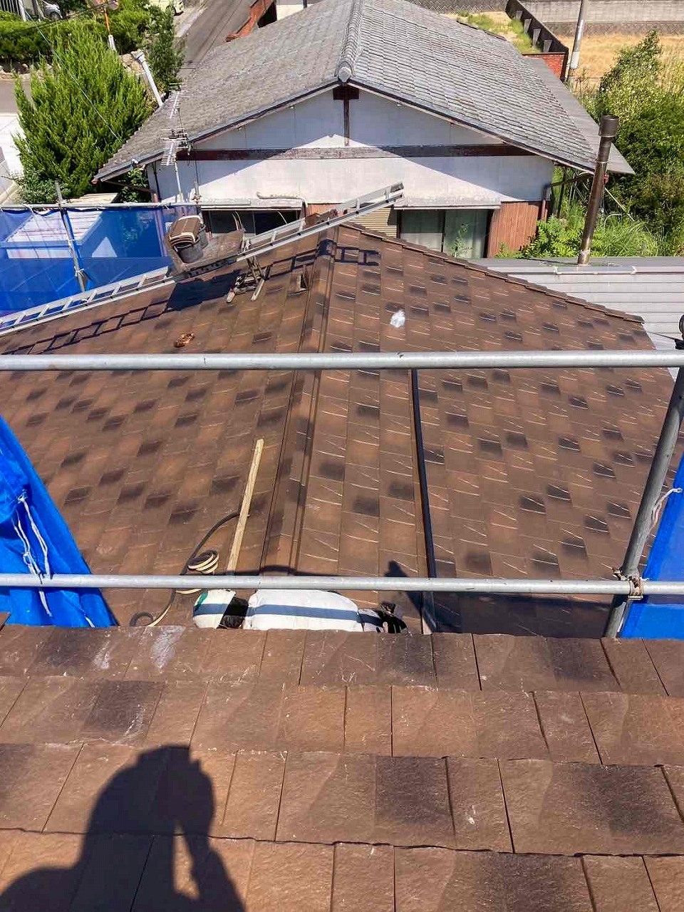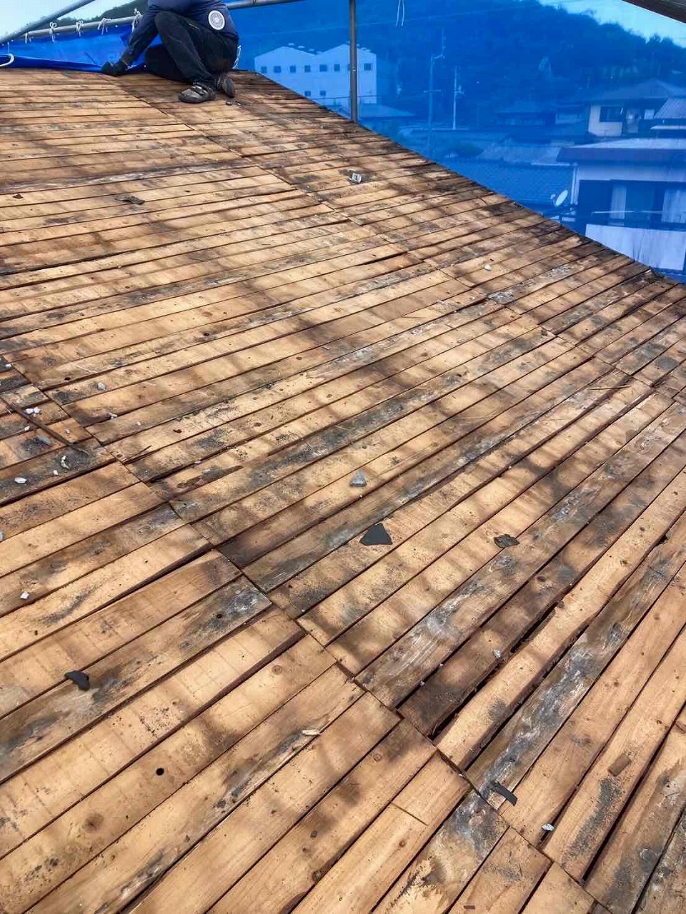 1.足場設置 2.既存瓦撤去 3.下地調整 4.コンパネ(野地板)施工 5.ルーフィング(防水シート) 6.ケイミューROOGA鉄平施工 7.完工