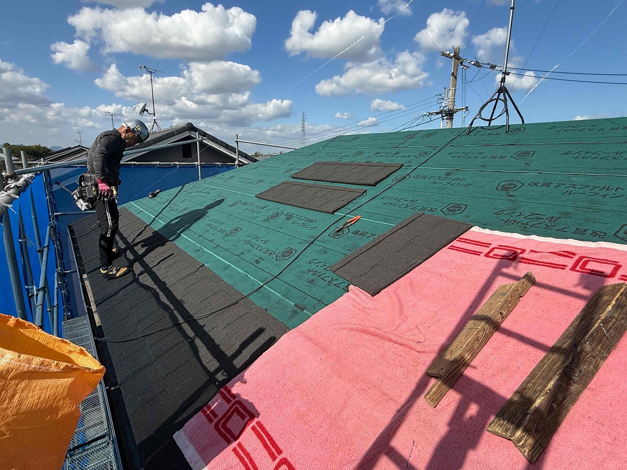 ①既存屋根高圧洗浄→②ルーフィング(防水シート)→③ガルバ屋根施工