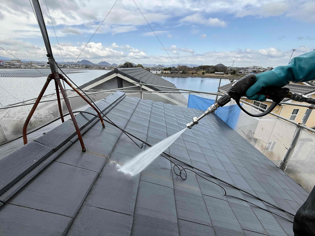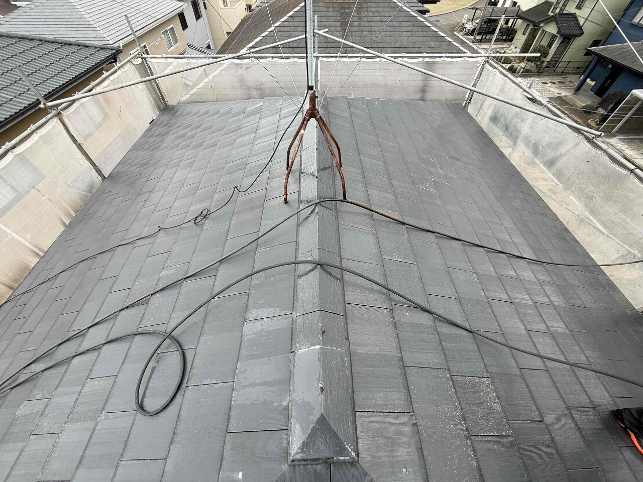 1.足場設置 2.高圧洗浄 3.屋根塗装3回塗り 4.足場解体 5.完工