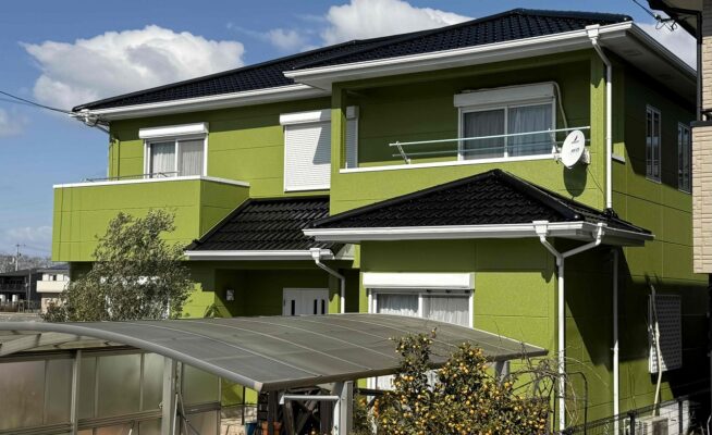 ご相談 外壁の塗膜が薄くなっており、防水機能が弱まっていた。工事内容 1.足場設置 2.高圧洗浄 3.養生 4.外壁塗装2回塗り・3回塗り 5.足場解体 6.完工